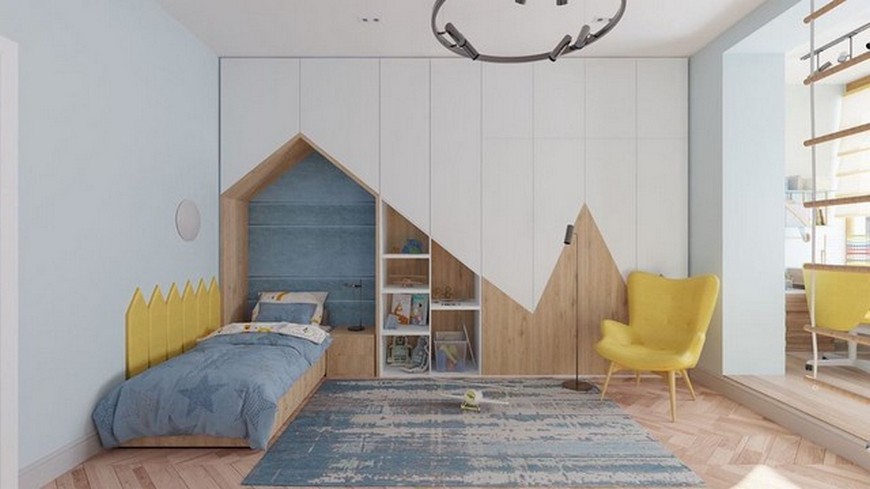 Yellow pieces give the room some thought-out colour pops, like in the armchair and the small picket fence on the wall. The patterned rug and the round lighting fixture add modernity to the bedroom.