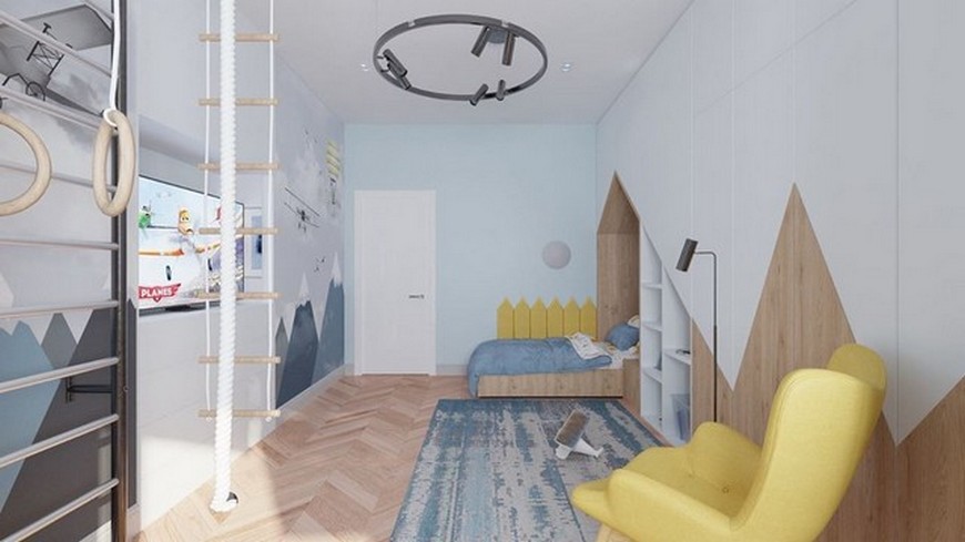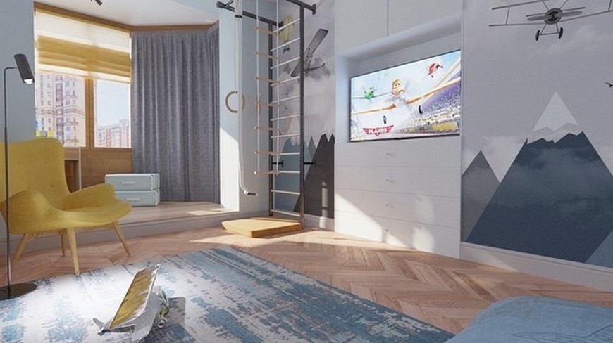 A cartoonish mountain range mural creates a sense of freedom and connection with the wild territory, which is something that always seems attractive to children. The studio also added exercise corner so the child can both play and stay active in the comfort of its own bedroom.