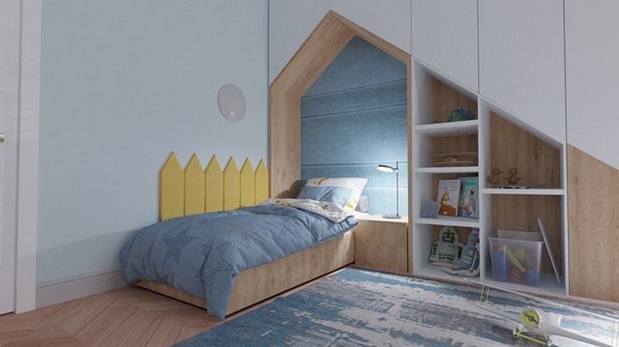 Geometric Vibes in this Amazing Kids Bedroom by CDF Design Studio ⇒ CDF Design Studio is a Russian practice that more than creating interiors, they have mastered the art of arranging and creating a proper lifestyle. Sophistication, allied with practicality and timeless design are some of the key features in each and every project the studio creates. On one of their late projects, they designed an incredible kids bedroom whose geometrical shapes give a fresh trendy and modern look while maintaining the pure fantasy side a child’s bedroom must always have.