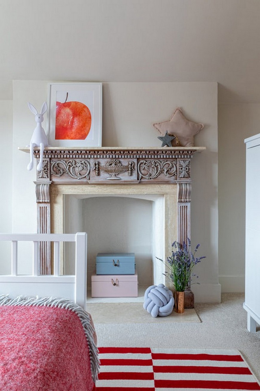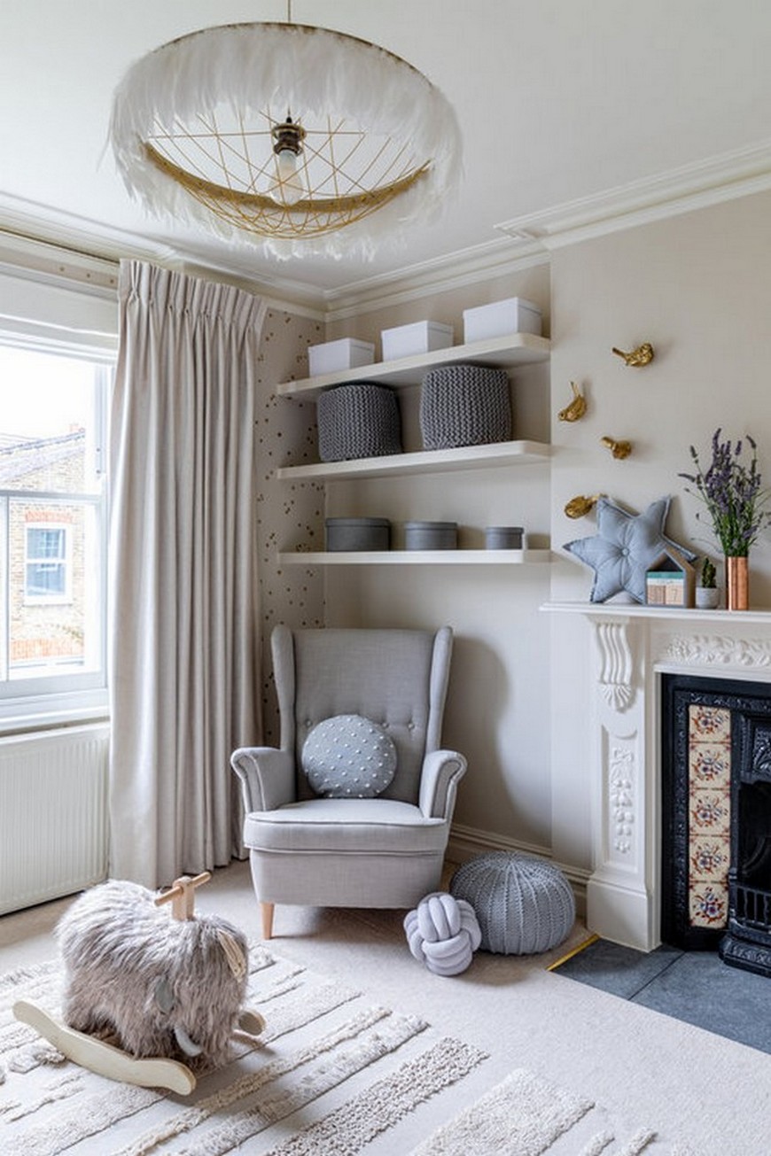 Rich grey tones paired with blush pinks to achieve romantic and welcoming nursery for baby Martha. In the spirit of Victorian architecture, the designer emphasized wall panelling by painting it in deep charcoal. Chest of drawers and baby cot also painted in the same shade to achieve a cohesive look.